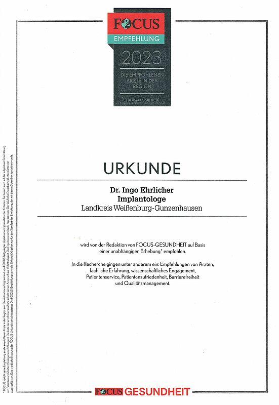 | 2000 | zertifizierte Anerkennung des Fachzahnarztes für zahnärztliche Chirurgie / Oralchirurgie durch die Zahnärztekammer Bayern |